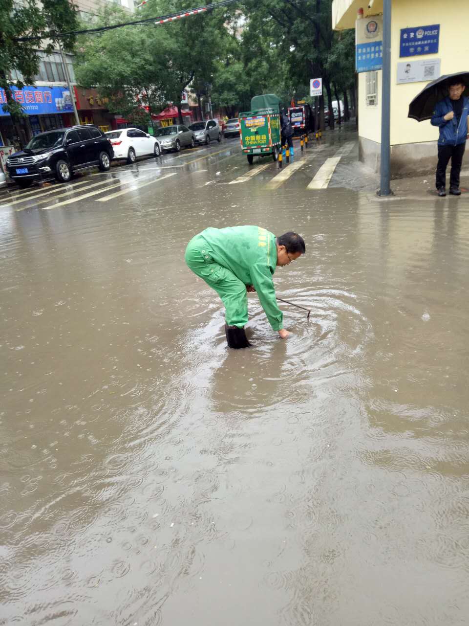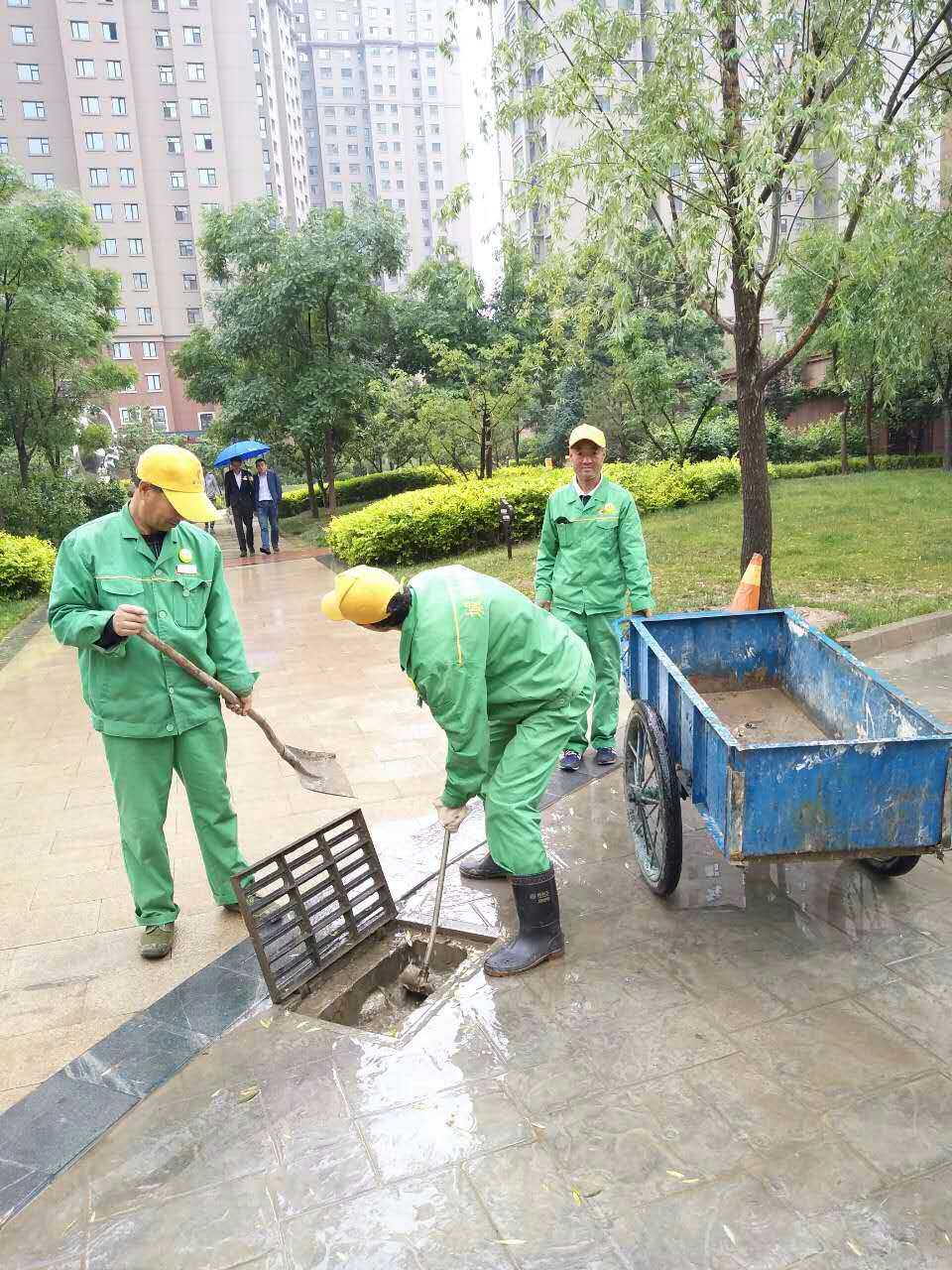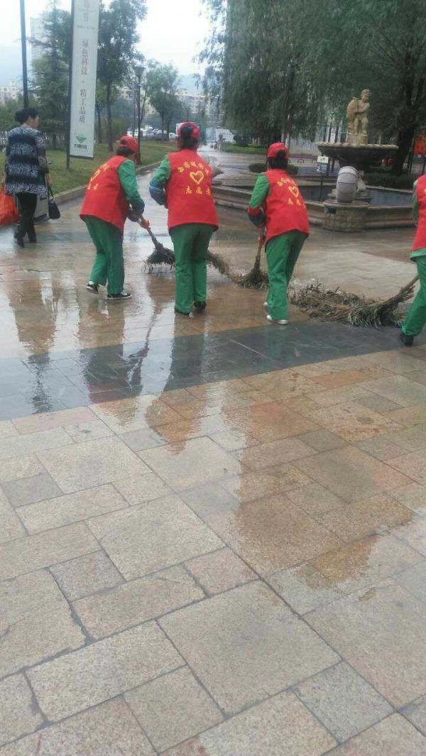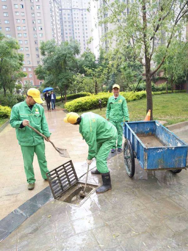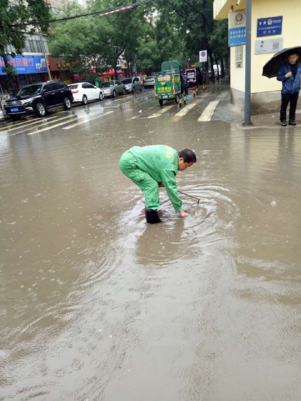 暴雨來襲,城關物業(yè)每位員工都堅守在抗擊暴雨的第一線。保安們在風雨中麻利的扛起一袋袋防汛沙袋壘在車庫、地下室等低洼地區(qū)的入口,以防雨水倒灌。保潔員們用清潔工具不停地將室內積水往外排,為了保證順利排水,在暴雨中查看下水道口,不顧水浸濕褲管和衣袖,直接將手伸進下水道口,把灌入的雜物清出。為了更迅速的排水,他們沒有打傘,兩手握著棍子奮力的疏通下水道。技術維修部的同事們時刻查看設備是否進水,是否正常運行。雖然是在室內,可是他們也已經渾身大汗,即使是這樣,也一刻不放松。據(jù)第一事業(yè)部王總介紹,此次暴雨雖說突然,但是對于各項目來說卻一點也不突然,因為自4月份開始,各項目部就已經成立了應急小組,儲備了防汛物資,如沙袋、手電等,再加上日常的演練,每個人都已經對自己的工作輕車熟路了,在這這樣的前提下安排工作省時又高效。因此,此次的防洪抗暴工作才能在最短的時間內達到最好的效果。