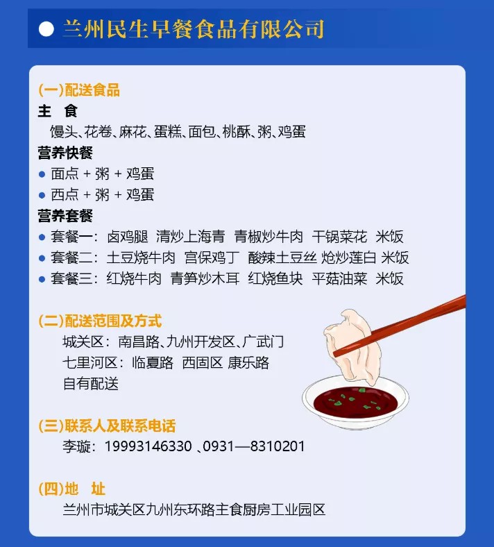 為了緩解當(dāng)前蘭州地區(qū)團(tuán)體就餐需求加大、居民外出就餐不便的問題,甘肅省商務(wù)廳指導(dǎo)蘭州市內(nèi)規(guī)模較大、防控措施到位、食品安全達(dá)標(biāo)的食品生產(chǎn)企業(yè)和餐飲企業(yè)開展餐飲配送服務(wù),經(jīng)過嚴(yán)格挑選,蘭州民生早餐食品有限公司確定為疫情期間首批餐飲配送企業(yè)。此次,城關(guān)物業(yè)與民生早餐共同為隔離小區(qū)、防疫點(diǎn)位、團(tuán)體單位及社會(huì)大眾配送餐品,全力滿足重點(diǎn)區(qū)域疫情期間基本生活需求。
