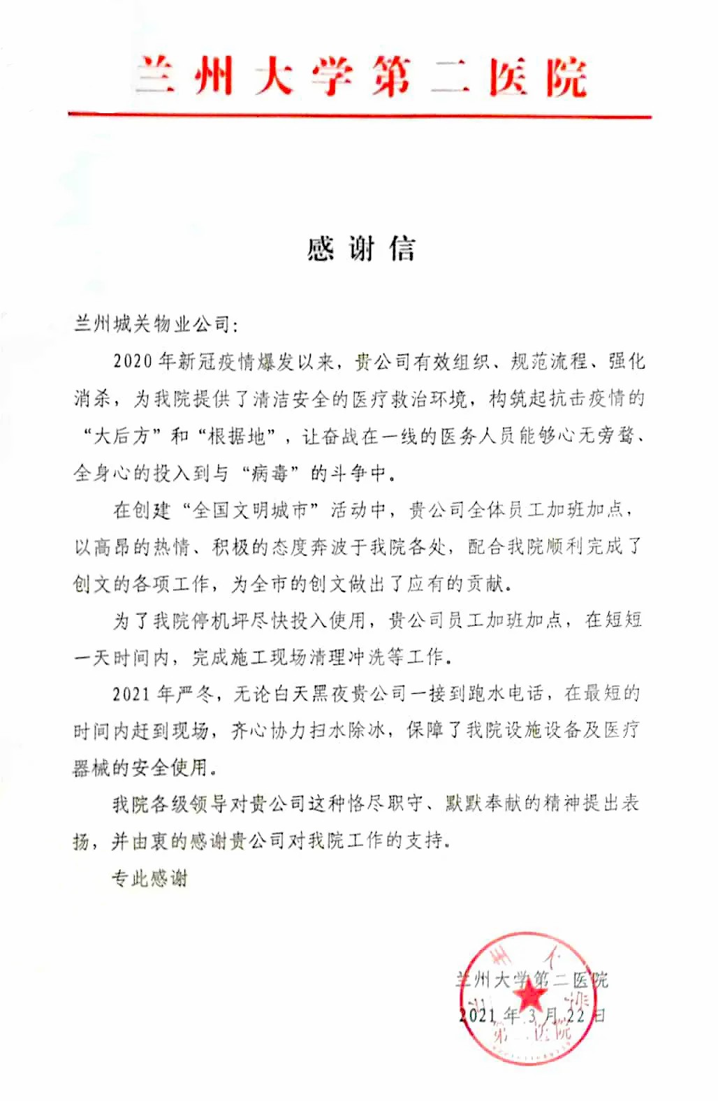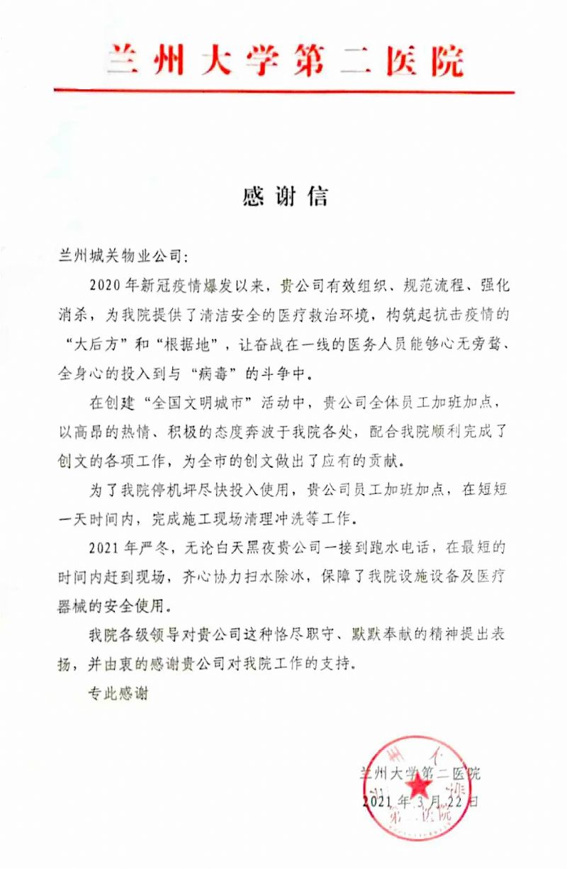 蘭州大學第二醫(yī)院后勤保障處劉處長一行人專程來到蘭州城關(guān)物業(yè)服務(wù)集團有限公司,將一面寫有“物業(yè)好管家 業(yè)主貼心人”的錦旗贈予蘭州城關(guān)物業(yè)服務(wù)集團有限公司總裁楊佳林手中,以此表達對于城關(guān)物業(yè)的感謝和認可。劉處長表示,2020年新冠疫情爆發(fā)以來,城關(guān)物業(yè)有效組織,規(guī)范流程,為醫(yī)院提供了清潔、安全的醫(yī)療救治環(huán)境,與醫(yī)院一起構(gòu)筑起抗擊疫情的“根據(jù)地”。城關(guān)物業(yè)加班加點保障醫(yī)院后勤的同時,積極配合醫(yī)院順利完成各項創(chuàng)文工作,為蘭州市創(chuàng)建全國文明城市做出了應(yīng)有的貢獻。